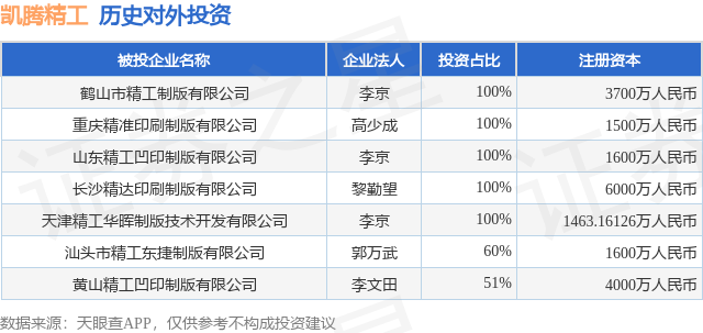 本站消息,根据天眼查APP显示速速查,凯腾精工(920553.BJ)新增一起对外投资事件,被投资公司为鹤山市精工制版有限公司,法定代表人李京,投资占比为100%。该公司从事印刷和记录媒介复制业,注册资本为3700万人民币。目前,凯腾精工共存在对外投资7项,详见下表: