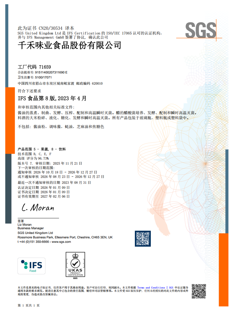 BRCGS FOOD与 IFS FOOD作为全球公认的食品安全管理体系认证,被誉为食品质量安全管理的“黄金标准”。本次SGS的审核覆盖千禾味业核心生产基地及酱油、醋、料酒等主流调味品产品线,对原料采购、生产加工、成品检验、仓储物流等全产业链环节逐一核查,全面验证各项控制措施的科学性与有效性。
